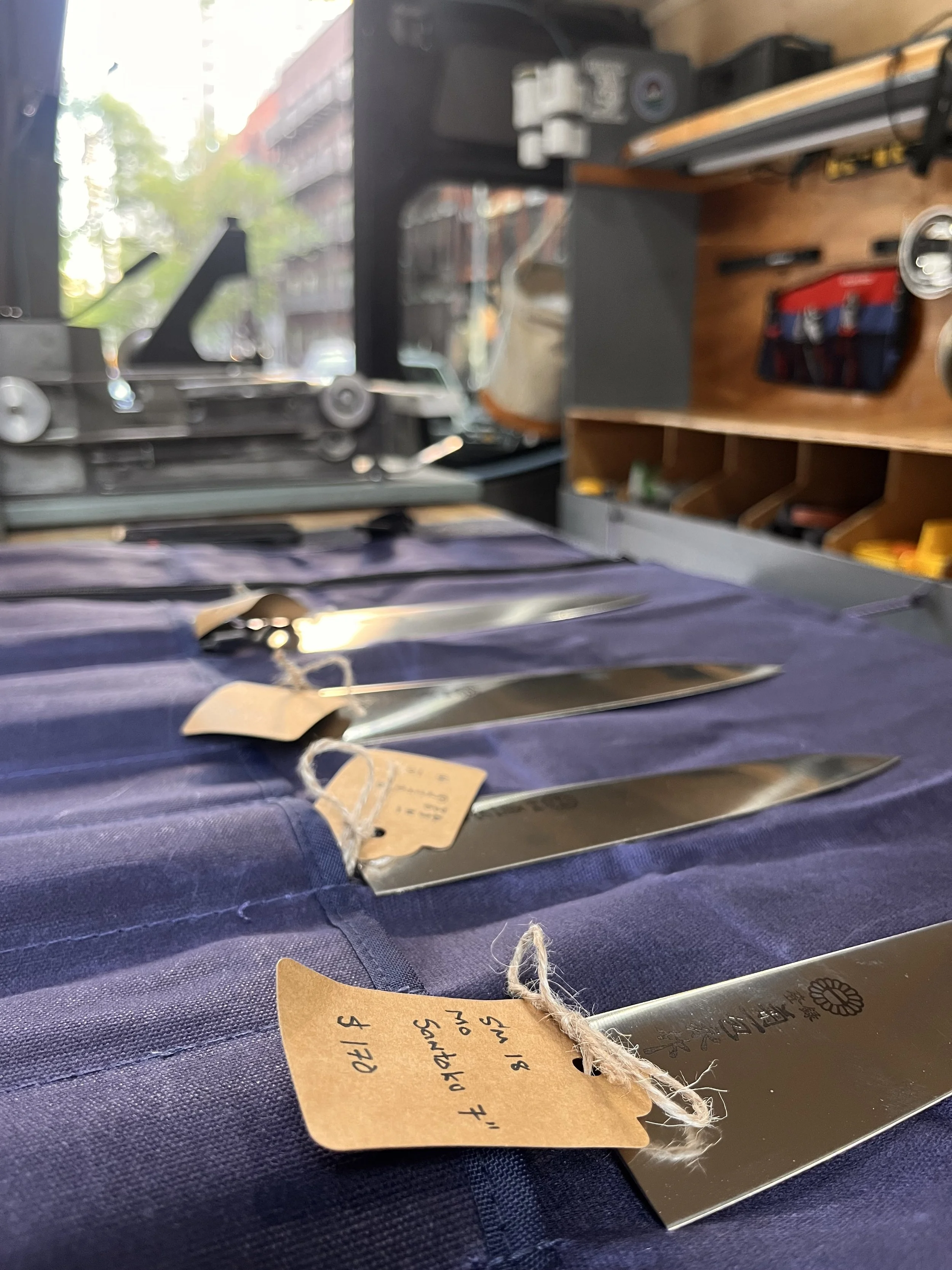 We work out of a Mercedes Sprinter equipped with a complete workshop, so we can provide sharpening services directly to you. We have the tools for both traditional whetstone sharpening methods and modern ceramic belt and wheel techniques, allowing us to be versatile and handle a wide range of items. We ensure each blade receives the precise care it needs to perform at its best.
